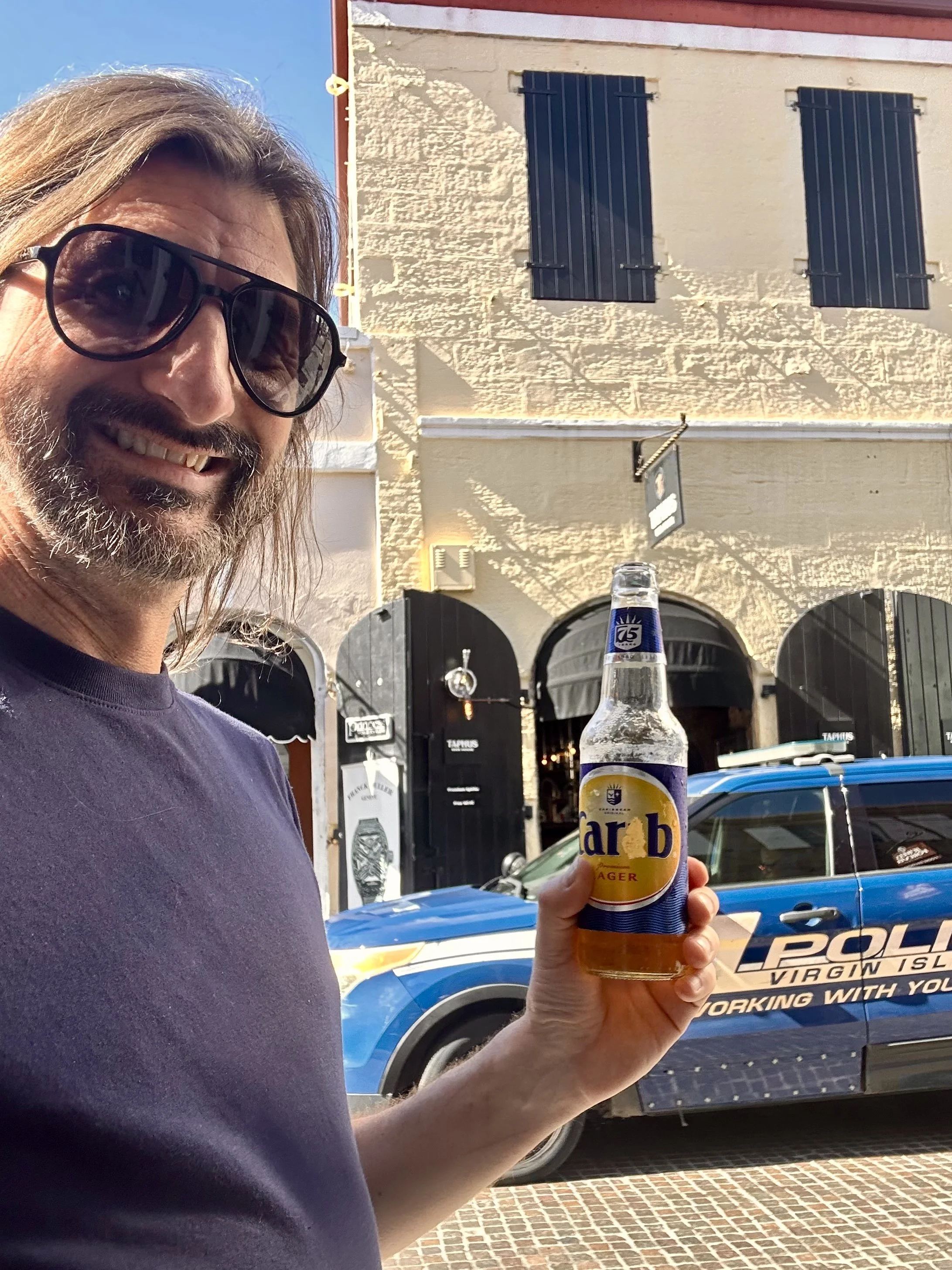 While Debra and Jason were waiting for her rings, the jewelry store offered Jason beer. As soon as the beer was in hand, the rings arrived. Jason asked if he was allowed to carry the open bottle of beer to the car. “Yes you can, Jason” said my wife. Jason was shocked that there was not an open container law in St. Thomas like there is in downtown Baltimore. After some reassurance that he wouldn’t get arrested for walking out the door with an open beer, he proudly strolled by a policeman on his way to the rental car he said “take my picture!” I think this was the exact moment Jason considered moving to St. Thomas.
