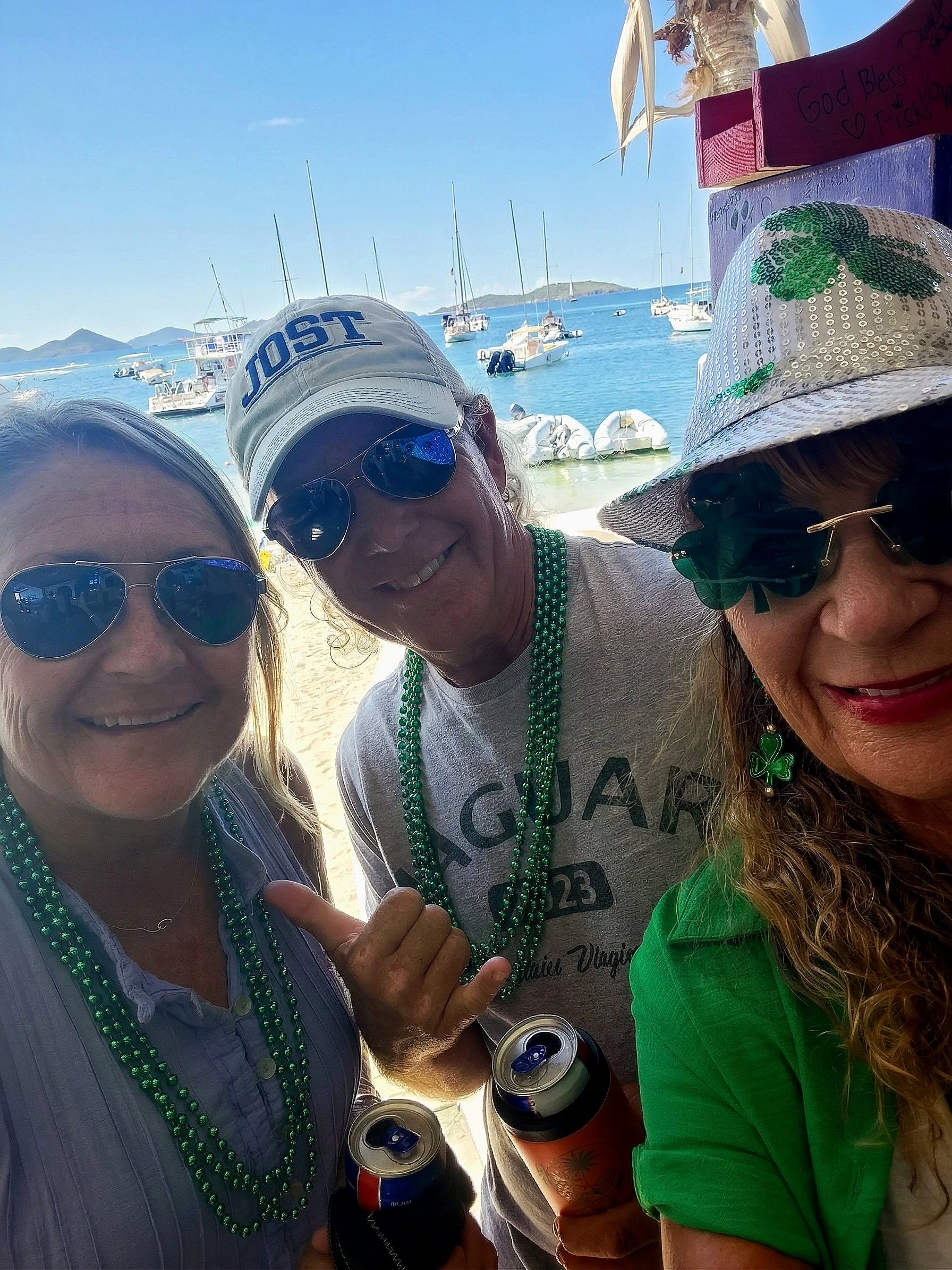 We set up the gear just in time. Meanwhile, Debra got to see her first St. John’s St. Patrick’s Day parade. In most parades, the participants throw bead necklaces and candy from the trucks to the spectators. Well, as we know, things are a little different in the Virgin Islands. While watching the parade, Debra got hit in the head by a beer can! Yep, they throw cans of beer from the Heineken truck. Thankfully, the Jameson truck was next. She did get a shot of whiskey from the Jameson truck, so I guess that helped numb the pain. Best St. Patricks Day Parade ever!